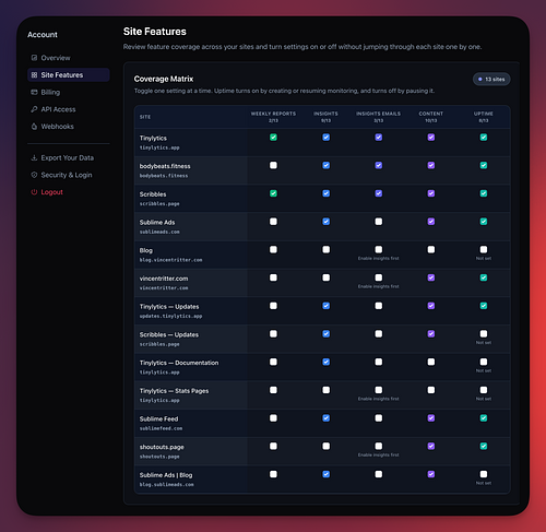Instead of usage caps, stress, and enterprise bloat, weβre building a simple, delightful, all-in-one human solution: privacy-first analytics + automatic site health monitoring (uptime, SSL, broken links, mixed content β all in one place). A tool that stays friendly and helpful even as your sites grow bigger.