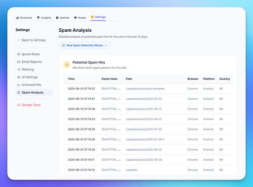 โข โญ๏ธ Added a new Spam Analysis page on your site settings that looks for patterns of spam within the last 14 days on your... August 31st, 2025 changelog