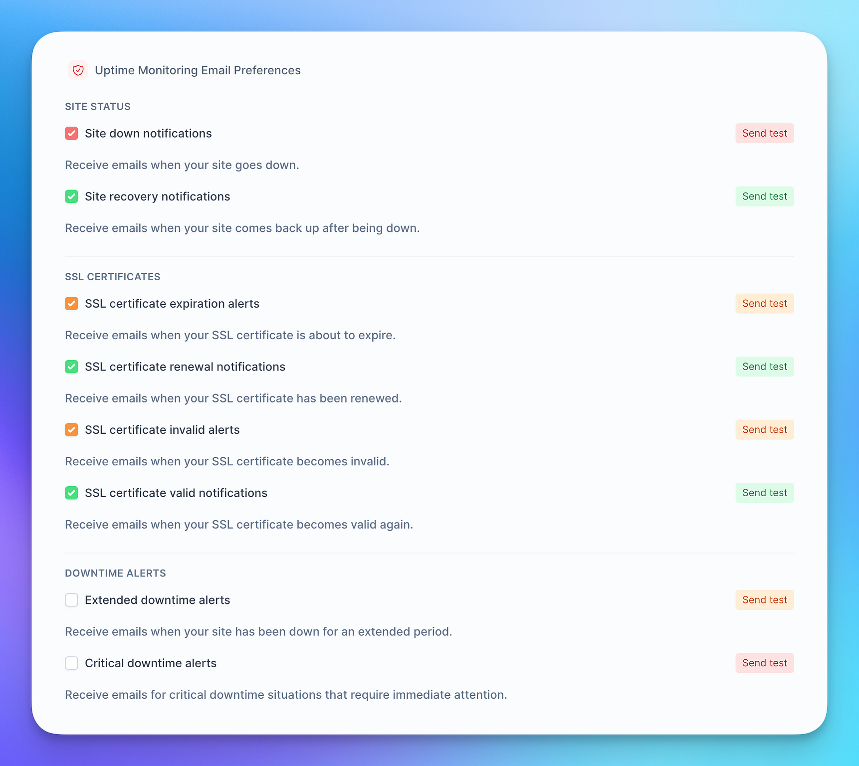 - 📨 You can now choose which uptime alerts you're going to get once you have monitoring set up. The options are in the email reports settings section for now, and I will improve this to be more general. You can get to it quickly by clicking on Uptime Settings and then clicking the link.
