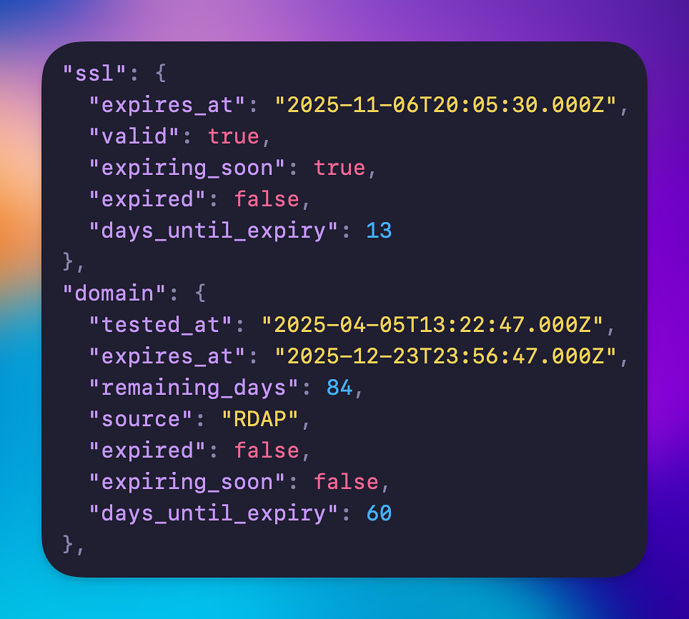 October 24th, 2025 changelog 👾 Added the domain info to the uptime monitor API endpoint, when available. Also tidied up the SSL data so that it's within its own object to keep things cleaner. Documentation can be found here.