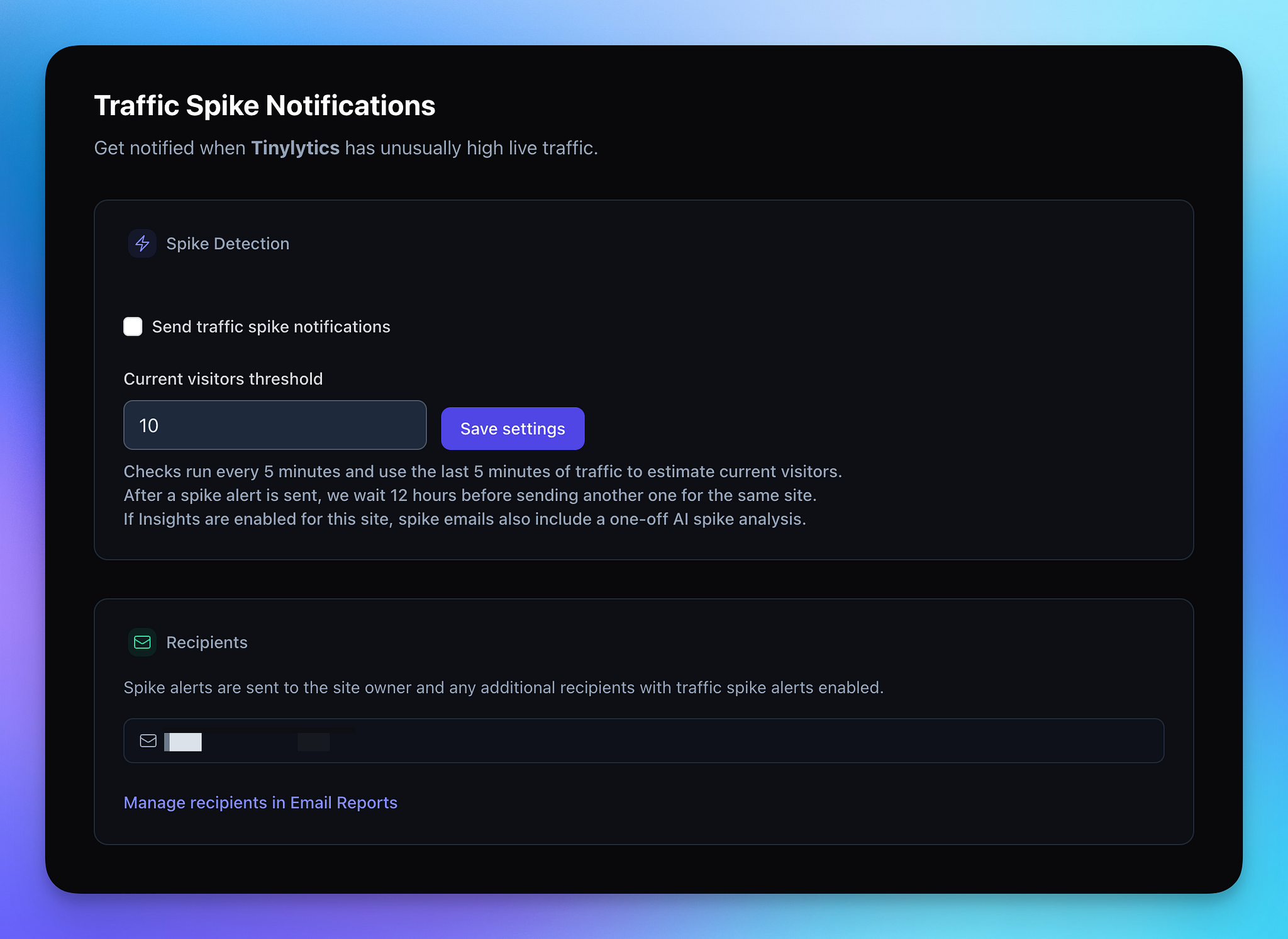 - ✨ Added the ability to set up Traffic Spike detection, for Plus subscribers, which sends you an email about the spike including what's happening and AI analysis if you have Insights enabled.